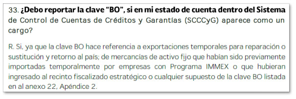 Un aspecto relevante del “BO”, es que al tratarse de una clave de pedimento general, la recomendación es declarar en el pedimento aduanal el identificador “AF” (Activo Fijo – Identificar el activo fijo, únicamente cuando la clave de documento no sea exclusiva para dicha mercancía), debido que el SCCCyG no identifica en forma automática a la clave “BO” como relacionada con activos fijos.