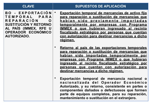 Debo resaltar que los trámites aduanales son identificados en la práctica aduanera con la clave pedimento “BO” para las operaciones de exportación temporal y de retorno a territorio nacional bajo los supuestos de aplicación que establece el Apéndice 2 del Anexo 22 de las Reglas Generales de Comercio Exterior para 2017: