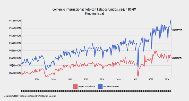 [1] Gobierno de México, Data México, Balanza Comercial México-Estados Unidos de América, en https://www.economia.gob.mx/datamexico/es/profile/country/estados-unidos?tradeBalance=salesOption.
